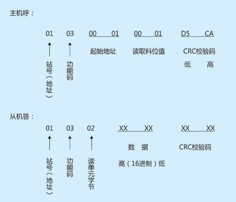 主機的命令格式是從機地址、功能碼、起始地址、字節(jié)數(shù)及CRC碼.