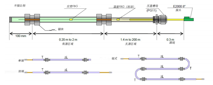傳感器由有源和無源部分組成。 有源部件包含測量光纖,并測量其兩端之間的變形,并將其轉(zhuǎn)換為光纖布拉格光柵的波長偏移。 無源部件對變形不敏感,用于將傳感器連接到解調(diào)儀。 在傳感器的無源部分,可以安裝松散的光纖布拉格光柵以進行溫度感測和補償。