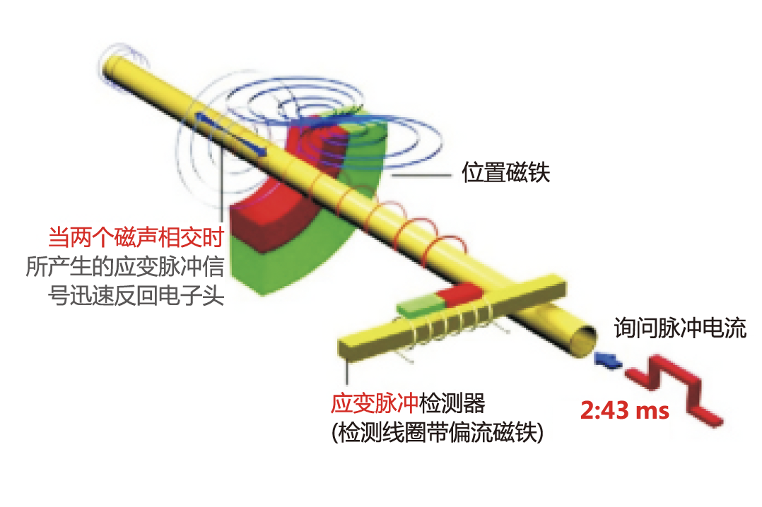 磁致伸縮位移(液位)傳感器,是利用磁致伸縮原理、通過(guò)兩個(gè)不同磁場(chǎng)相交產(chǎn)生一個(gè)應(yīng)變脈沖信號(hào)來(lái)準(zhǔn)確地測(cè)量位置的。測(cè)量元件是一根波導(dǎo)管,波導(dǎo)管內(nèi)的敏感元件由特殊的磁致伸縮材料制成的。測(cè)量過(guò)程是由傳感器的電子室內(nèi)產(chǎn)生電流脈沖,該電流脈沖在波導(dǎo)管內(nèi)傳輸,從而在波導(dǎo)管外產(chǎn)生一個(gè)圓周磁場(chǎng),當(dāng)該磁場(chǎng)和套在波導(dǎo)管上作為位置變化的活動(dòng)磁環(huán)產(chǎn)生的磁場(chǎng)相交時(shí),由于磁致伸縮的作用,波導(dǎo)管內(nèi)會(huì)產(chǎn)生一個(gè)應(yīng)變機(jī)械波脈沖信號(hào),這個(gè)應(yīng)變機(jī)械波脈沖信號(hào)以固定的聲音速度傳輸,并很快被電子室所檢測(cè)到。由于這個(gè)應(yīng)變機(jī)械波脈沖信號(hào)在波導(dǎo)管內(nèi)的傳輸時(shí)間和活動(dòng)磁環(huán)與電子室之間的距離成正比,通過(guò)測(cè)量時(shí)間,就可以高度精確地確定這個(gè)距離。由于輸出信號(hào)是一個(gè)真正的絕對(duì)值,而不是比例的或放大處理的信號(hào),所以不存在信號(hào)漂移或變值的情況,更無(wú)需定期重標(biāo)。