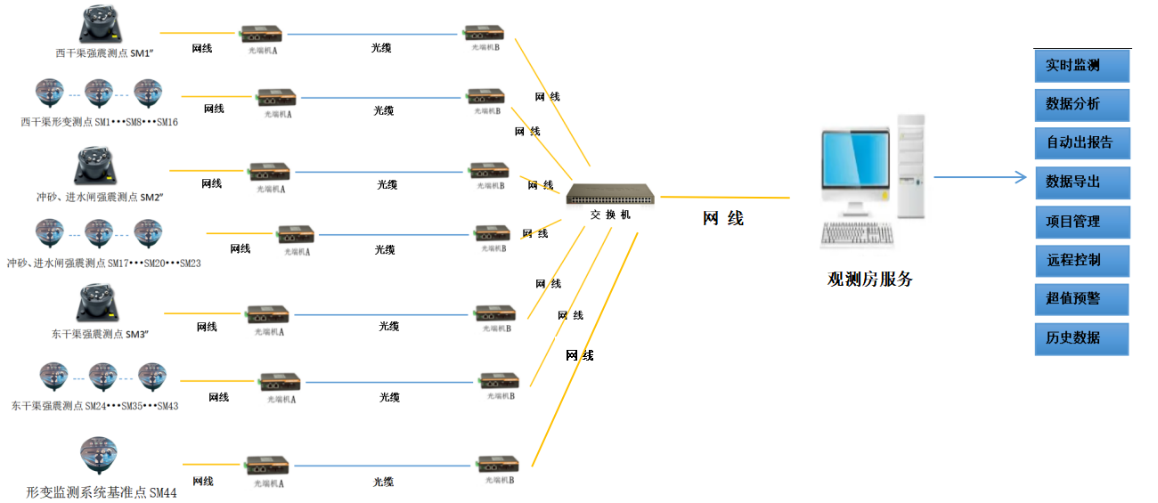 閘門的強(qiáng)震測(cè)點(diǎn),通過(guò)強(qiáng)震儀拾取到地面的振動(dòng)信號(hào)后,通過(guò)儀器內(nèi)部傳感器及采集軟件將振動(dòng)信號(hào)轉(zhuǎn)換成數(shù)字信號(hào),再通過(guò)通過(guò)光纜傳送到水庫(kù)管理房的數(shù)據(jù)匯集處理中心,在數(shù)據(jù)匯集處理中心安裝大壩強(qiáng)震動(dòng)監(jiān)測(cè)系統(tǒng)軟件后,軟件對(duì)收到的加速度信號(hào)進(jìn)行實(shí)時(shí)的分析處理及儲(chǔ)存;發(fā)生地震時(shí)間后,自動(dòng)出具符合相關(guān)規(guī)范的地震事件分析報(bào)告。
