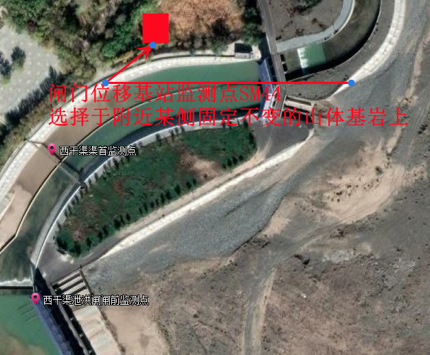 本次監(jiān)測(cè)方案為三屯河水庫(kù)閘門形變及強(qiáng)震監(jiān)測(cè),三屯河三道閘門俯瞰圖如下: