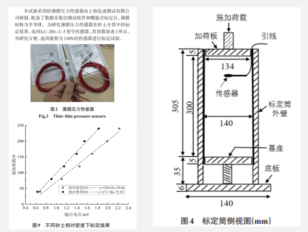 巖土工程現(xiàn)場及室內(nèi)模型試驗(yàn)中常用剛性土壓力盒測量土壓力,但傳統(tǒng)剛性土壓力盒(SPC)由于隔膜下陷、 “嵌入”效應(yīng)、不能完全貼合測量表面、需要較大的埋設(shè)空間等自身局限性,在測量例如樁或埋地管道等彎曲表面土 壓力時(shí)并不適用?;诒∧毫鞲衅鳎‵SR)的特點(diǎn)設(shè)計(jì)了測量電路和標(biāo)定裝置,分析了標(biāo)定特性,并初步探究了撓 度對薄膜壓力傳感器(FSR)測量的影響,最后通過試驗(yàn)對比分析了傳統(tǒng)剛性土壓力盒(SPC)和薄膜壓力傳感器(FSR) 測量彎曲表面土壓力的性能。結(jié)果表明薄膜壓力傳感器(FSR)能有效避免“嵌入”效應(yīng),減小測量誤差,并且安裝方便。