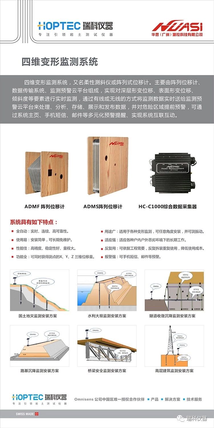 瑞科儀器這次將在論壇展示國內(nèi)首創(chuàng)四維高精度測試系統(tǒng)。該系統(tǒng)主要由陣列位移計(jì)(又稱柔性測斜儀)、數(shù)據(jù)傳輸系統(tǒng)、監(jiān)測預(yù)警云平臺組成,陣列位移計(jì)實(shí)現(xiàn)對深層形變位移、表面形變位移、傾斜角度等要素進(jìn)行實(shí)時(shí)監(jiān)測,通過有線或無線的方式將監(jiān)測數(shù)據(jù)實(shí)時(shí)送給監(jiān)測預(yù)警云平臺來處理、分析、存儲、展示和發(fā)布數(shù)據(jù),并對危險(xiǎn)區(qū)域提前預(yù)警,可通過系統(tǒng)主頁、手機(jī)短信、郵件等多元化預(yù)警提醒,實(shí)現(xiàn)系統(tǒng)互聯(lián)互動。