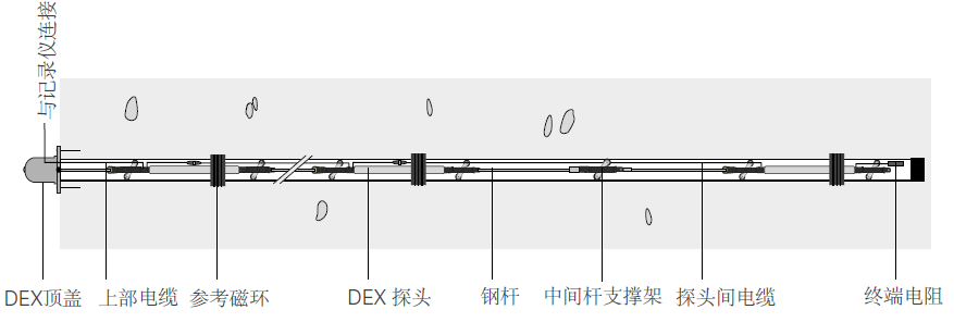 DEX沉降儀與DEX-S類似,但沒有測斜傳感器,有一個用于監(jiān)測垂直位移的高性能非接觸式磁性傳感器。因此DEX探頭鏈僅適用于讀取垂直位移。