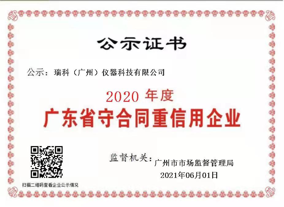 再傳捷報!瑞科儀器榮獲“2020年度 廣東省守合同重信用企業(yè)”認定