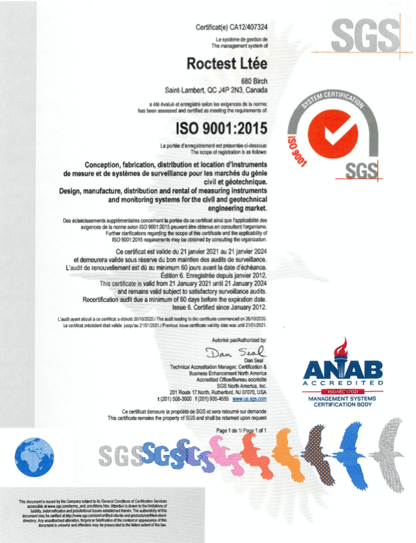 加拿大Roctest公司經(jīng)過(guò)評(píng)估和認(rèn)證,符合ISO 9001:2015的要求。注冊(cè)范圍為土木和巖土工程市場(chǎng)設(shè)計(jì)、制造、分銷和租賃測(cè)量?jī)x器和監(jiān)測(cè)系統(tǒng)。