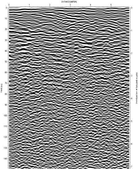 雷達剖面圖示例:在 0-2 米深度范圍內(nèi)可識別出若干雙曲線(雙曲線代表地下存在目標(biāo)物),但受表層填充材料導(dǎo)電性影響,探測深度受到較大限制