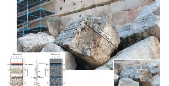 起初,工作人員并不清楚西墻中方石的尺寸,因此嘗試使用了750MHz450MHz兩種天線。為獲取這些古老石材的準(zhǔn)確電磁波傳播速度,團隊首先對西墻外地面上鋪設(shè)的方石進行了測量:將得到的雷達剖面圖與方石的實際測量厚度進行匹配,由此確定了一個準(zhǔn)確的速度范圍——該速度范圍為西墻內(nèi)部隱藏方石的成像提供了關(guān)鍵參數(shù)。完成這一步驟后,工作人員才開始對西墻本體展開探測。