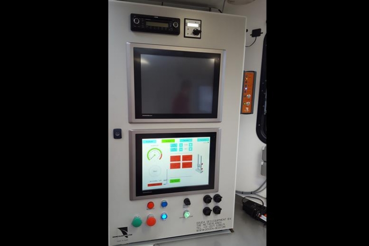 CPT貫入系統(tǒng)位于履帶式卡車的工作艙內(nèi)。在它旁邊,是操作貫入系統(tǒng)上下運(yùn)動(dòng)的桿,所有的電子設(shè)備、發(fā)動(dòng)機(jī)控制面板和控制元件都位于電氣柜內(nèi)。