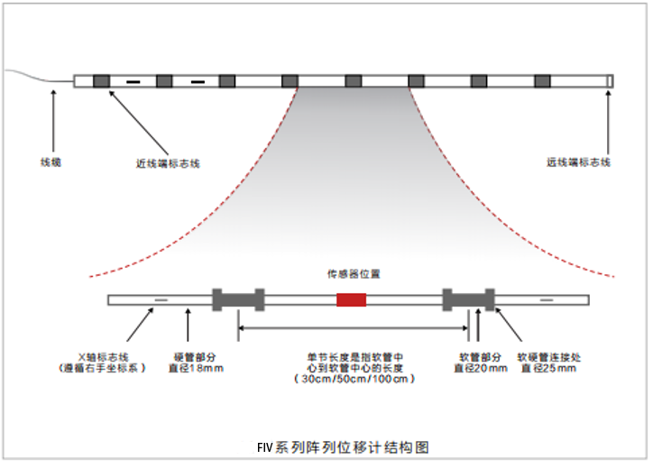 FIV系列陣列位移計(jì)是由高強(qiáng)度的陣列式固定長(zhǎng)度測(cè)量單元組成,單元間使用能承受較大應(yīng)力與變形的柔性接頭進(jìn)行連接,每節(jié)測(cè)量單元上均標(biāo)有X軸標(biāo)志線。