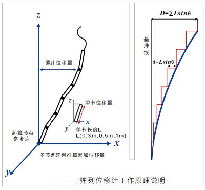?每個(gè)測(cè)量單元長(zhǎng)度為L,則第i個(gè)測(cè)量單元在重力方向的坐標(biāo)系中對(duì)應(yīng)的坐標(biāo)長(zhǎng)度為 d=L*Sinθi,對(duì)應(yīng)的第i個(gè)測(cè)量單元在整體坐標(biāo)系中的坐標(biāo)為第1個(gè)測(cè)量單元到第i個(gè)測(cè)量單元的累加值D=∑L*Sinθi。