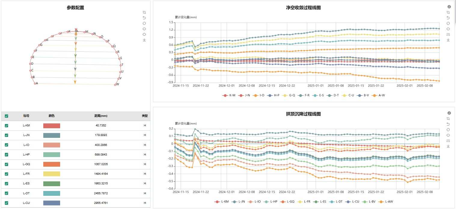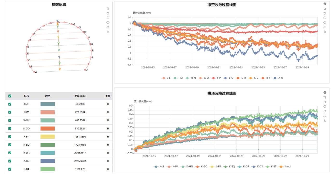 根據(jù)詳勘與補(bǔ)勘資料,揭露<7C>與<9C-2>巖面突起侵入頂管范圍,為避免巖面處理不到位,矩形頂管卡殼,調(diào)整為兩個(gè)圓形盾構(gòu)。盾構(gòu)全長(zhǎng) 60.28m,左右線間距 1m,管片采用外徑 5.0m,內(nèi)徑 4.5m 的圓形管片。該項(xiàng)目采用瑞科FIV陣列位移計(jì)實(shí)時(shí)三維監(jiān)測(cè)系統(tǒng)對(duì)多個(gè)隧道斷面進(jìn)行收斂監(jiān)測(cè),為施工期和運(yùn)維期的安全監(jiān)測(cè)提供了有效的數(shù)據(jù)支持。