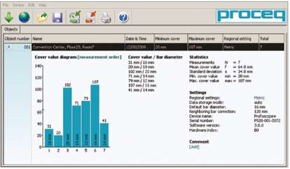 Profoscope+的圖表顯示窗口可列出現(xiàn)場(chǎng)測(cè)量結(jié)果中的所有必要信息。所有測(cè)量結(jié)果,可以利用ProfoLink軟件方便地進(jìn)行分析和處理。