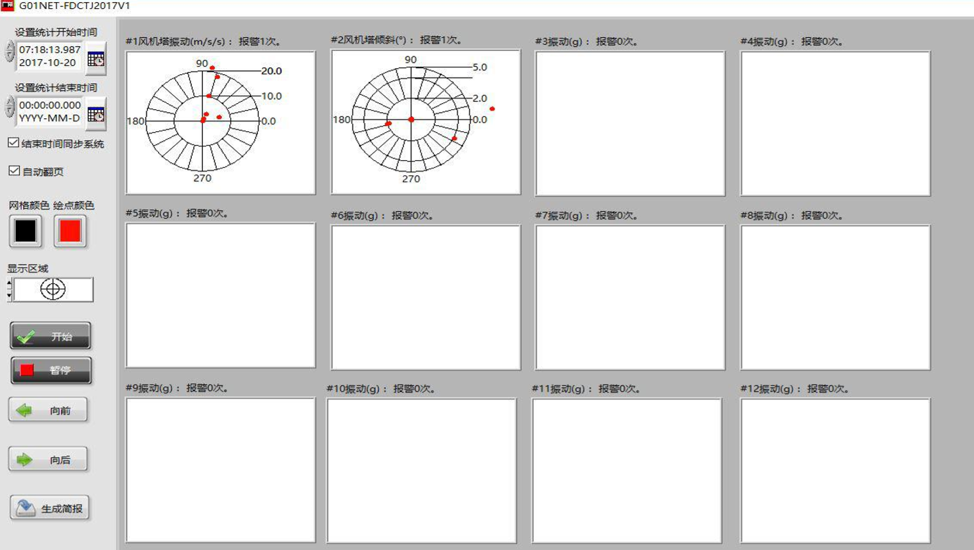 此軟件基于G01NET-FDC監(jiān)測軟件在線分析結(jié)果,定時統(tǒng)計各被監(jiān)測建筑物動力響應(yīng)參量的報警情況,且通過極坐標視圖實時繪制和更新統(tǒng)計結(jié)果。其界面如上圖。軟件基本功能如下: