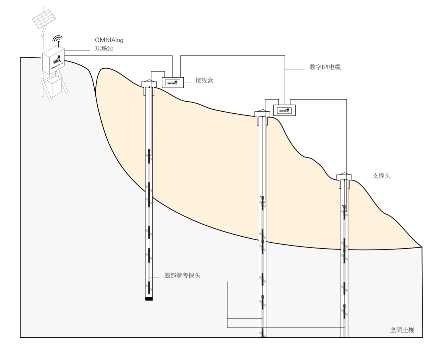 經(jīng)過多次手動(dòng)測斜儀測量后,便確定了滑動(dòng)面。因此,可以通過在滑移面附近安裝IPI并在每個(gè)測斜管的底部安裝一個(gè)IPI作為參考來完成自動(dòng)監(jiān)測。