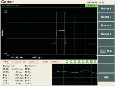 測試曲線 光0.3157km處被拉伸產了明顯的應變,應變值為約為4992.6με。