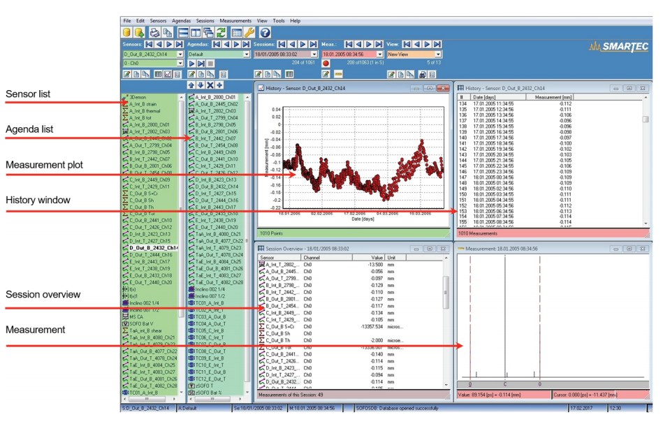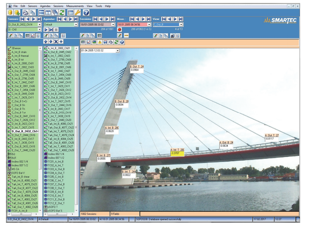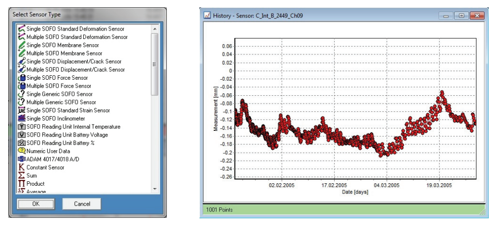 宏觀傳感器的“測量”值通過將數(shù)學(xué)函數(shù)(由用戶定義)應(yīng)用于由真實傳感器(SOFO、MuST、熱電偶等)進(jìn)行的測量并存儲在SDB數(shù)據(jù)庫中來獲得。宏觀傳感器的定義是通過用戶友好的界面完成的。這種傳感器的表示和性能與實際傳感器相同,即它們可以在表格和圖表中可視化,甚至可以進(jìn)一步用于獲得更高層次的宏觀傳感器。通過這種方法,可以創(chuàng)建有意義的宏觀傳感器,如平均曲線傳感器(從兩個平行傳感器獲得)、平均剪切應(yīng)變傳感器(從兩個交叉?zhèn)鞲衅鳙@得)、熱應(yīng)變傳感器(從溫度測量獲得)、荷載傳感器(從總應(yīng)變和熱應(yīng)變之差獲得)等。